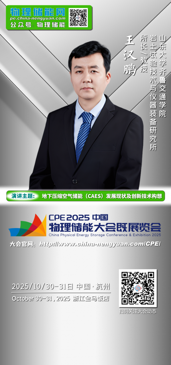 本次大会有幸邀请到山东大学齐鲁交通学院王汉鹏岩土试验技术与仪器装备研究所所长、教授出席。王先生将在大会现场发表题为“地下压缩空气储能(CAES)发展现状及创新技术构想”的主题演讲。