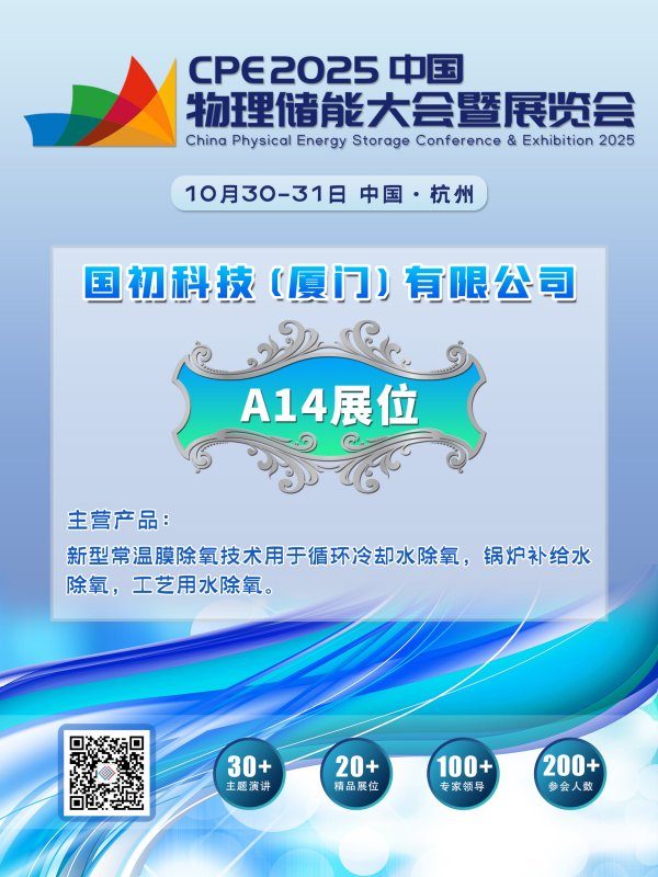 国初科技(厦门)有限公司将亮相《CPE 2025中国物理储能大会暨展览会》,日前,专注于分离纯化技术应用推广的国家级高新技术企业——国初科技(厦门)有限公司(简称“国初科技”)确认将携循环冷却水膜除氧系统、循环冷却水膜除碳系统、锅炉补给水膜除氧系统等核心技术进行现场展示。欢迎各位莅临其展位参观!