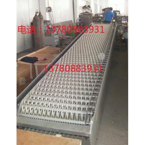 自清式格栅除污机主要由机架、驱动装置、齿耙及传动链条组成。由ABS工程塑料、尼龙6、尼龙1010或不锈钢制成特殊形状的耙齿按一定次序装配在齿耙轴上,形成一条封闭的耙齿链。水下栅片(耙齿)截留污物沿轨上行,当达到顶部时,因弯轨和齿轮的导向作用,使相邻耙齿间产生相对推移运动,将污物外推,依自重卸入污物盛器内。同时特制转刷将耙齿上微量残留污物剔除干净。