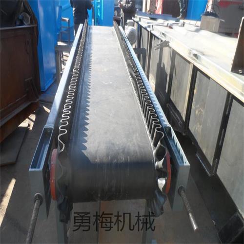 挡边带式输送机是在平形橡胶运输带两侧粘上可自由伸缩的橡胶波形立式“裙边”,在裙边之间又粘有一定强度和弹性的横隔板组成匣形斗,使物料在斗中进行连续输送的一种皮带输送设备。该输送机可广泛用于煤炭、粮食、建材、化工、水电和冶金等部门,在环境温度为-19℃~+40℃范围内,输送堆积比重为0.5-2.5t/m3的各种散状物料。对于输送有特殊要求的物料,如高温、具有酸、碱性、油类物质或有机溶剂等成分的物料,需采用特殊的挡边输送带。带式输送机输送带宽度有400、500、600、700、800、1000、1200mm等,也可按客户需求采用其它特殊规格。波状挡边皮带机_挡板带式输送机的结构与通用皮带输送机基本相似,主要区别是采用了特制的裙边波状挡边输送带。