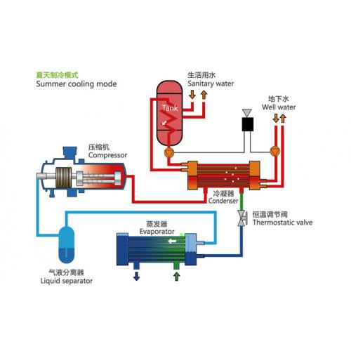 通常主机冷凝器产生的废热,由冷却塔或是地源热泵地下换热器散热排至周围环境。回收主机冷凝器产生的废热,为末端供暖提供热源或是提供生活热水。