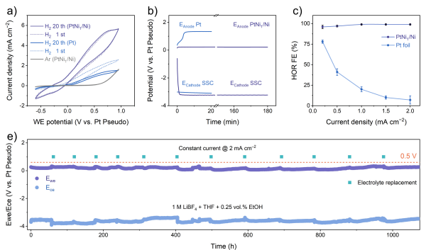 PtNi1催化剂表现出了卓越的性能:在THF电解液中,其HOR法拉第效率接近100%,且稳定性超过1000小时,抗毒化性能远优于商业Pt电极。
