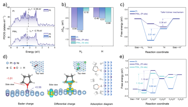 针对这一难题,中国科学院长春应用化学研究所研究团队设计并合成了镍单原子表面调控的铂基催化剂(PtNi1)。该设计利用Ni单原子通过“配体效应”优化Pt位点的电子结构,促进氢中间体(H*)的吸附—脱附行为,有效降低了决速步能垒,从而加速了HOR本征动力学。研究构筑的对四氢呋喃(THF)电解液强吸附的Ni单原子中心,能优先吸附竞争性有机分子,避免了Pt位点被毒化失活,同时提高了THF自身的氧化分解能垒,从而抑制Pt位点上发生溶剂氧化反应。
