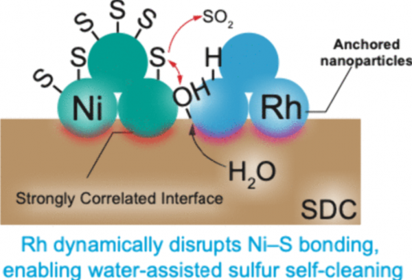 研究结果表明,在镍基 SOFC 阳极中加入铑(Rh)元素,会形成双金属纳米颗粒,这些颗粒不仅能够主动抵抗硫中毒,还能在蒸汽作用下自动再生。这一发现首次直接解释了为什么掺铑改性的SOFC阳极在含硫燃料条件下仍能保持稳定性能。对这一机制的深入理解将有助于推动燃料电池在实际应用中的可行性。